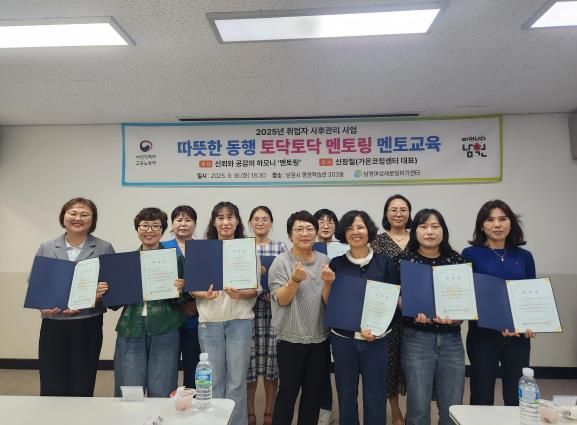 내고향뉴스 고광만 기자 | 남원여성새로일하기센터는 초기 직장 적응에 어려움을 겪는 취업자들을 지원하기 위해 9월부터 11월까지 '따뜻한 동행 토닥토닥 멘토링' 사업을 추진한다.