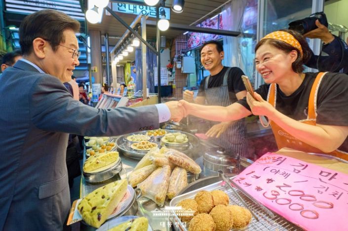 상인들은 박수로 이 대통령을 맞으며 연신 사진을 찍었고, “일 정말 잘하고 계십니다”, “고생 많습니다”, “파이팅입니다”를 외쳤다.