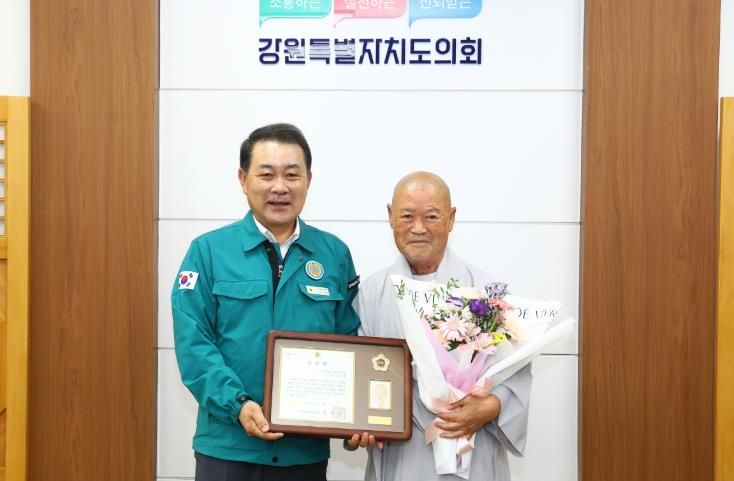 내고향뉴스 채필재 기자 | 강원특별자치도의회는 9월 18일, 강원특별자치도의회에서 지역사회 봉사와 종교․문화 발전에 기여한 공로로 원주지역의 현각스님(원주 성불원 주지)에게 감사패를 전달했다.