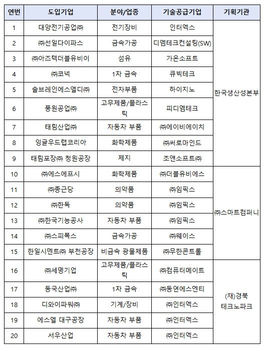 작년 선정기업 중 우수사례를 발표한 ㈜코아비스는 온도와 외부먼지 등에 취약한 자동차부품 생산라인에 무인 환경을 구축하고 가상현실에서 인공지능 기술을 활용해 최적의 공정관리·제어를 구현했다. 그 결과 생산성이 56% 향상됐고 공정설비 트러블도 20% 감소했다.