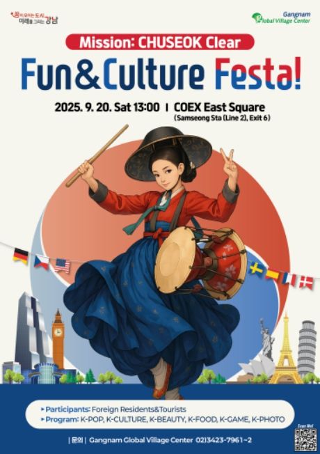 내고향뉴스 채필재 기자 | 꿈이 모이는 도시, 미래를 그리는 서울시 강남구가 9월 20일 오후 1시부터 5시까지 코엑스 동측광장(영동대로 513)에서 외국인 주민과 관광객이 함께하는 다문화 축제 ‘펀앤컬처 페스타 Fun&Culture Festa! (미션 : 추석 클리어)’를 연다.