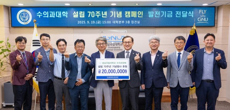 내고향뉴스 임정빈 기자 | 진주 동명고등학교를 졸업한 수의사들로 구성된 ‘동수회’(회장 김도경 동명대학교 반려동물대학 학장)가 경상국립대학교 수의과대학 설립 70주년 기념행사 후원을 위해 발전기금을 출연했다. 발전기금 전달식은 9월 19일 오후 3시 대학본부 3층 접견실에서 열렸다.