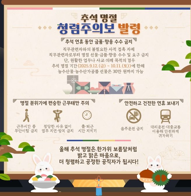 시는 청렴주간 동안 ▲추석 명절을 앞둔 청렴 캠페인 ▲청렴한데이 ▲청렴 포럼 및 청렴 골든벨 ▲청렴정책 만족도 조사 등을 추진한다.