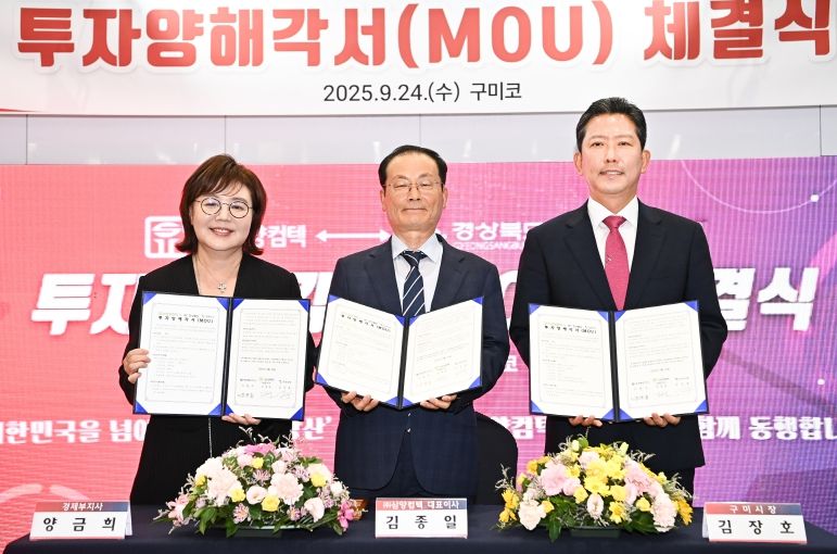 내고향뉴스 라정운 기자 | 구미시는 9월 24일 구미코 경북라운지에서 2025 항공방위물류박람회(GADLEX) 개막 행사 전에 양금희 경상북도 경제부지사, 김장호 구미시장, 박교상 구미시의회 의장, 김종일 대표이사 등이 참석한 가운데 ㈜삼양컴텍와 경상북도·구미시 간 투자양해각서(MOU)를 체결했다.