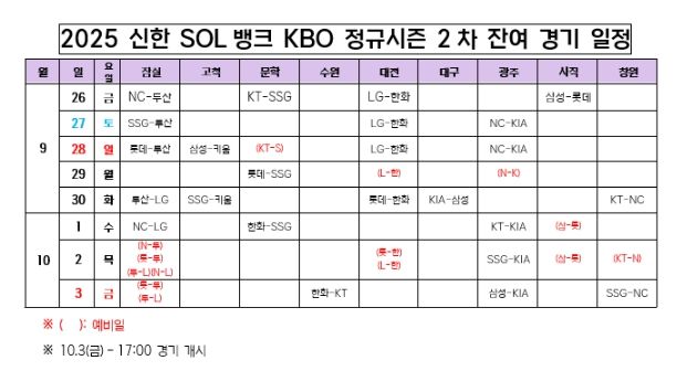 내고향뉴스 임정빈 기자 | KBO는 26일(금) 2025 신한 SOL뱅크 KBO 정규시즌 2차 잔여 경기 일정을 확정했다.