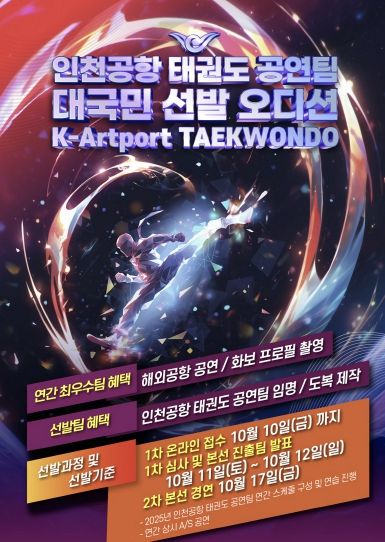 내고향뉴스 채필재 기자 | 인천국제공항공사는 인천공항에서 진행되는 태권도 상설공연인 ‘2025-2026 인천공항 태권도 상설공연’에 참여할 태권도 전문 공연팀을 공개 모집한다고 28일 밝혔다.