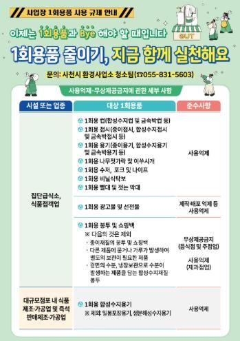 이번 점검은 경상남도와 18개 시·군이 공동으로 추진하는 ‘1회용품 사용규제 사업장 집중(합동) 점검 계획’에 따라 진행되며, 사천시는 자체 점검반과 도-시군 합동 점검반을 편성해 적극 참여한다.