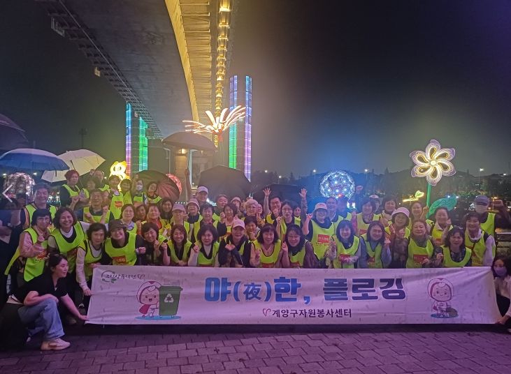 내고향뉴스 임정빈 기자 | 인천 계양구자원봉사센터는 지난 24일 저녁, ‘계양아라온 아트웨이(빛의 거리 3단계)’와 ‘가을꽃 국화축제’가 열리는 현장에서 자원봉사자 74명과 함께 ‘야(夜)한 플로깅’ 봉사활동을 진행했다.