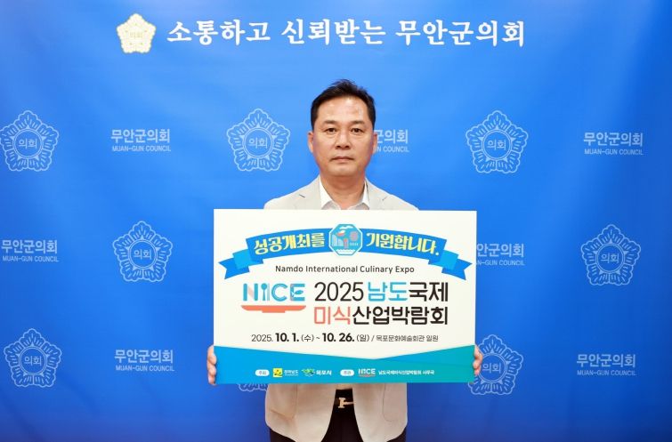 내고향뉴스 채필재 기자 | 무안군의회 이호성 의장은 김산 무안군수와 박종대 영암군의회 의장의 지명을 받아 오는 10월 1일부터 26일까지 목포문화예술회관 일원에서 열리는 ‘2025 남도국제미식산업박람회’ 성공을 기원하는 릴레이 응원 캠페인에 동참했다.