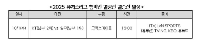 9월 29일(월) 열린 2025 퓨처스리그 챔피언 결정전 준결승전에서 남부리그 2위 KT는 북부리그 1위 한화를, 남부리그 1위 상무는 북부리그 2위 LG를 꺾고 각각 결승 진출에 성공했다.