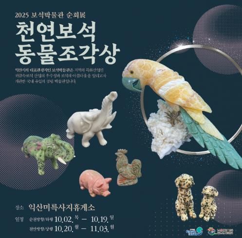 내고향뉴스 정미경 기자 | 익산시 보석박물관은 추석 연휴가 시작되는 10월 2일부터 11월 3일까지 익산미륵사지휴게소(양방향)에서 '천연보석 동물조각상' 순회전시를 진행한다.