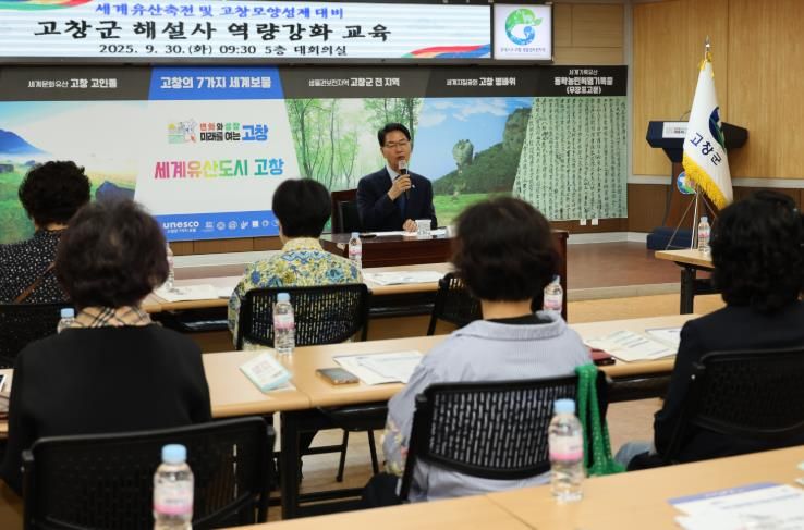 내고향뉴스 정미경 기자 | 고창군이 30일 군청 5층 회의실에서 ‘2025 세계유산축전(10월2~22일)’과 ‘제52회 고창모양성제(10월29일~11월2일)’를 앞두고 해설사 친절교육을 실시했다.