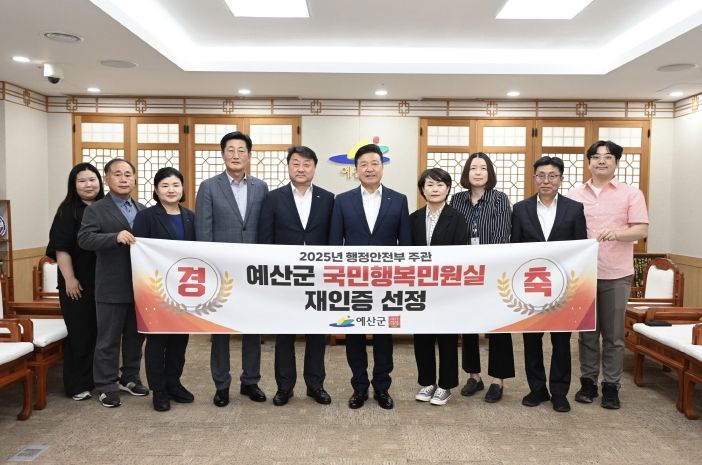 내고향뉴스 박성환 기자 | 예산군은 행정안전부가 주관하는 ‘2025년 국민행복민원실’ 평가를 통과해 재인증 기관으로 선정됐다고 17일 밝혔다.