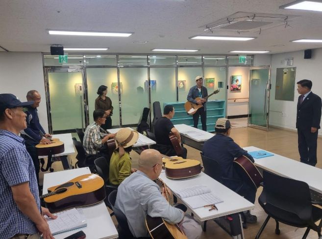 내고향뉴스 임정빈 기자 | 고성군이 운영하는 고성군종합사회복지관 분관에서는 10월 17일 저녁, 야간노래교실과 통기타반 수강생들을 격려하기 위해 이상근 군수가 직접 현장을 방문했다.