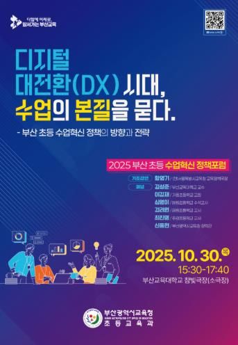 내고향뉴스 채필재 기자 | 부산광역시교육청은 오는 30일 오후 부산교육대학교 참빛극장에서 초등 교원과 교육전문직원 등 200여 명을 대상으로 ‘디지털 대전환(DX)* 시대, 수업의 본질을 묻다’를 슬로건으로 ‘2025 부산 초등 수업혁신 정책포럼’을 개최한다고 밝혔다.