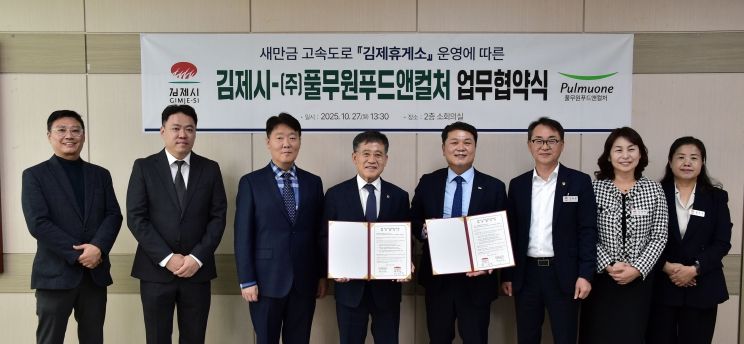 내고향뉴스 임정빈 기자 | 김제시는 27일 ㈜풀무원푸드앤컬처와 '새만금전주간' 고속도로 개통에 따라 새롭게 조성되는‘김제휴게소’운영에 따른 업무협약을 체결했다고 밝혔다.