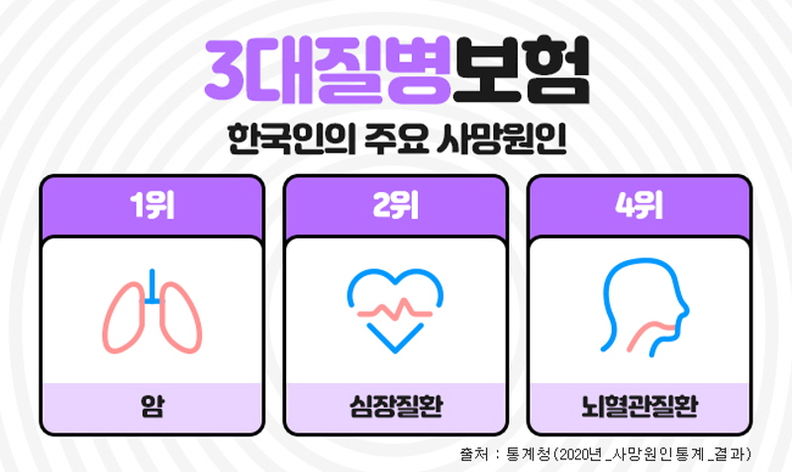 내고향뉴스 임정빈 기자 | 한국인의 주요 사망원인중에 암, 뇌혈관질환, 심혈관질환은 흔히 3대질병이라 일컬어지며 살아가면서 가장 먼저 대비해야 하는 중대질병으로 항상 강조되고 있다. 이들 질병에 미리 대비하기 위해 가입하는 것이 진단비보험인데, 이러한 3대질병진단비를 중점으로 보장하는 보장성보험이 3대진단비보험 이다. 3대질병진단비보험은 각각의 질병에 주목해서 보장하기도 하지만, 나에게 맞는 추가 특약을 잘 골라서 가입한다면 종합건강보험으로도 충분히 활용도가 높다.