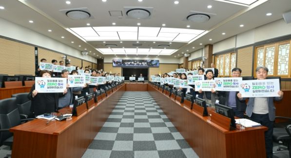 내고향뉴스 윤환열 기자 | 거제시는 12월 1일 거제시청 중회의실에서 열린 확대간부회의 직후, 거제시장을 비롯한 간부 공무원 63명이 함께한 가운데 ‘1회용품 제로화 청사 선언’을 진행했다.
