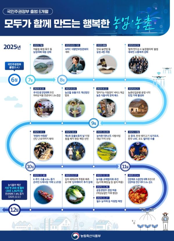 이를 위해 농식품부는 현장 체감형 정책 과제를 발굴·개선하는 한편, 지난 9월 확정된 농업·농촌분야 4대 국정과제 추진에 박차를 가하고 있다. 또한, ‘K-농정협의체’, ‘모두의 농정 ON’ 등 온·오프라인 채널과 장·차관의 적극적인 현장행보를 통해 농업인 등 정책 고객들의 의견을 광범위하게 수렴하여 정책에 빠르게 반영하고 있다.