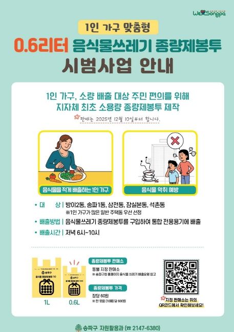내고향뉴스 윤환열 기자 | 서울 송파구가 전국 지방자치단체 최초로 1인 가구에 최적화된 0.6ℓ 규격의 음식물쓰레기 종량제봉투를 오는 10일부터 시범 도입해 운영한다고 알렸다.