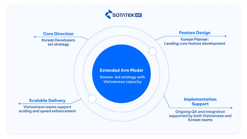 전통적으로 명확한 문서와 고정된 요구사항을 우선하는 방식과 달리, SotaTek Korea는 "Korean Hybrid Delivery" 모델을 구축했다. 이 모델에서 한국인 개발자·기획자·디자이너가 지속적으로 변경되는 요구사항과 고객과의 직접 커뮤니케이션이 필요한 핵심 업무를 담당한다. 반면, 베트남 개발자는 보다 안정적인 영역을 중심으로 ‘extended arm’ 역할을 수행하며 한국 팀의 역량을 확장하는 데 기여한다.