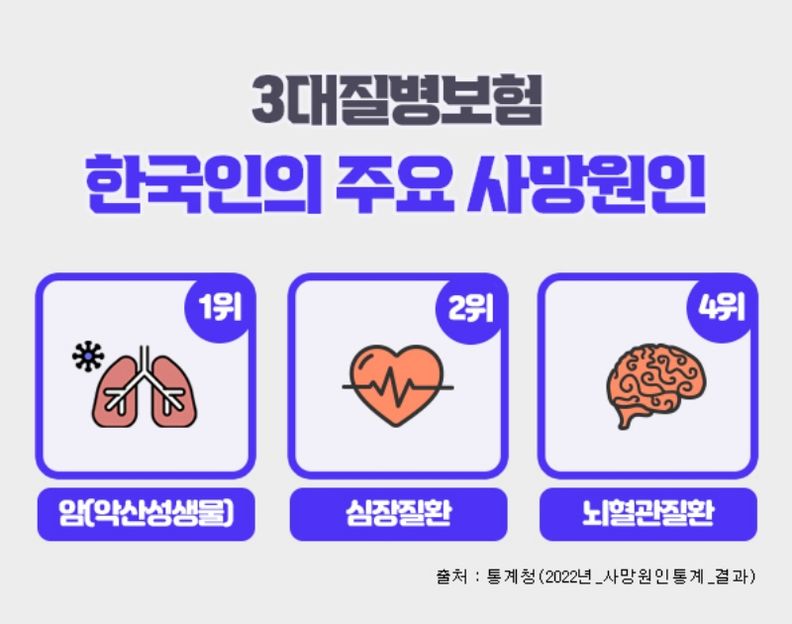 내고향뉴스 임정빈 기자 | 흔히 3대질병이라 일컫는 암, 심혈관질환, 뇌혈관질환은 통계청 발표자료에 따르면 한국인의 주요 사망원인 중에서 3위 폐렴을 제외하고 1~4위를 차지하고 있으며, 이전부터 지금까지도 살면서 가장 먼저 대비해야 하는 치명적인 질병으로 강조되고 있다. 이러한 중대질병에 대비하기 위하여 상기 세가지 치명적인 질병을 집중보장하는 3대질병진단비보험을 많이 가입하고 있다. 3대진단비보험은 각각의 질병을 중점적으로 보장하면서도 가입자 특성에 맞는 특약을 추가함으로써 종합건강보험으로도 활용할 수가 있다.