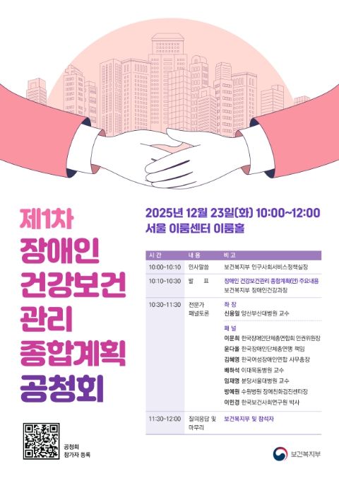 내고향뉴스 김익성 기자 | 보건복지부는 12월 23일 오전 10시 서울 여의도 이룸센터에서 ‘제1차 장애인 건강보건관리 종합계획(안)’에 대한 공청회를 개최했다.