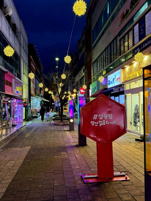 내고향뉴스 김명신 기자 | 양산시는 지난 23일 경상남도 제1호 소상공인 특화거리인 양산젊음의거리 경관조명 설치사업이 마무리됐다고 밝혔다.