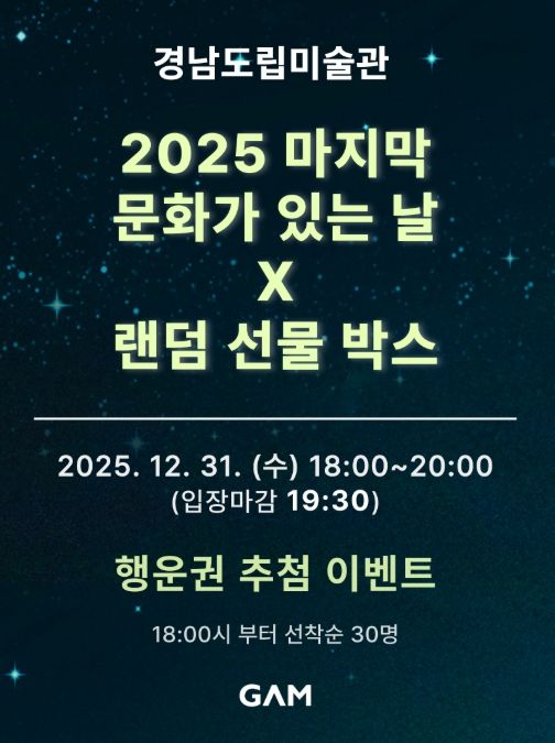 내고향뉴스 김명신 기자 | 경남도립미술관은 12월 31일 ‘문화가 있는 날’을 맞이해 연말을 함께 즐길 수 있는 특별 이벤트를 마련한다고 밝혔다.