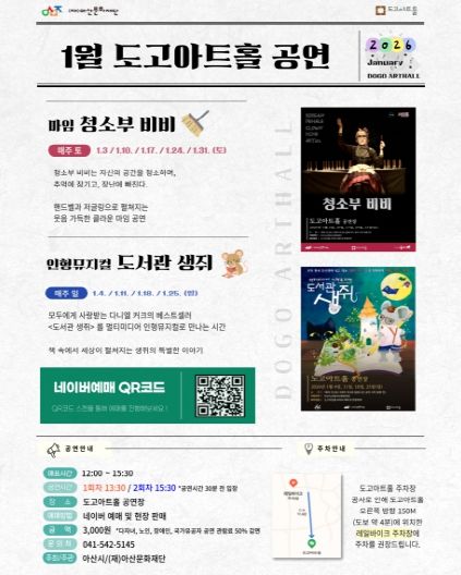 아산문화재단 관계자는 “2026년 새해를 맞아 도고아트홀이 공연과 전시를 함께 즐길 수 있는 생활 문화 공간으로 자리매김하길 기대한다”며 “앞으로도 연령과 세대를 아우르는 다양한 콘텐츠를 통해 시민들의 문화 접근성을 지속적으로 높여 나가겠다”고 말했다.