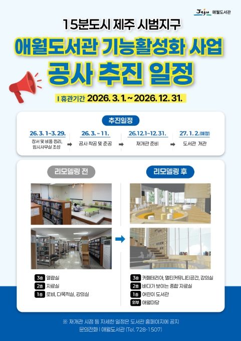내고향뉴스 김명신 기자 | 제주시 애월도서관은 ‘15분도시 도서관 기능활성화 사업’ 추진에 따른 전면 리모델링 공사로 3월 1일부터 12월 31일까지 휴관한다.