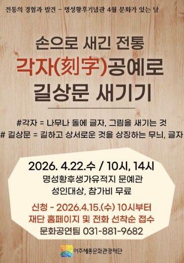 내고향뉴스 김명신 기자 | 여주세종문화관광재단은 오는 4월 22일, 명성황후기념관 4월 문화가 있는 날 프로그램으로 '손으로 새긴 전통, 각자(刻字)공예로 길상문 새기기'를 진행한다.