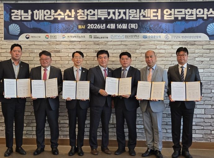 내고향뉴스 임정빈 기자 | 경상국립대학교 해양과학대학은 경상남도 해양수산 창업투자 활성화를 위해 4월 16일 경남테크노파그에서 경상남도, 경남테크노파크, 경남항노화연구원, 수협중앙회 경남본부, 경상남도 청년어업인연합회 등과 업무협약(MOU)을 체결했다.
