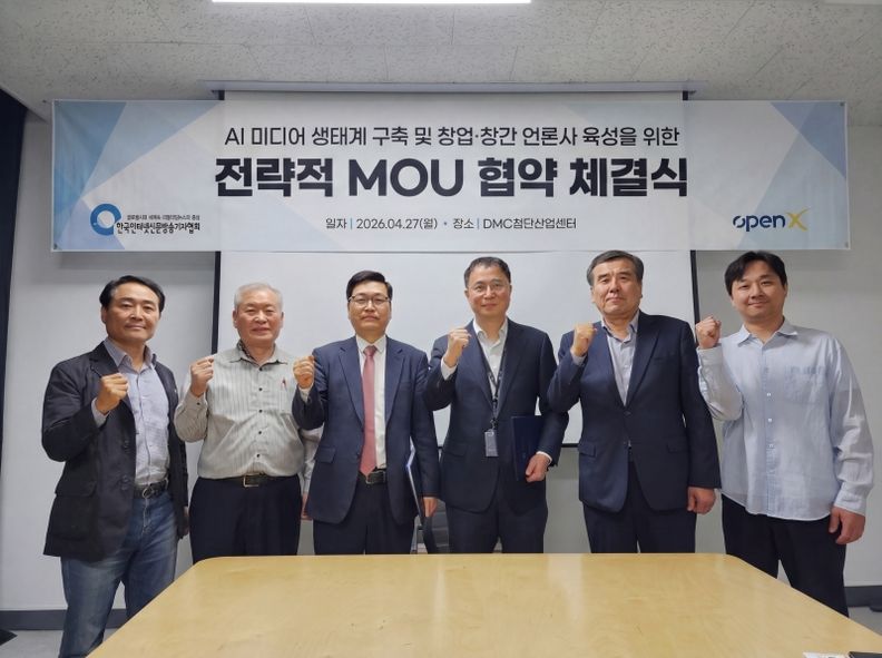 내고향뉴스 채필재 기자 | 한국인터넷신문방송기자협회(회장 전병길, 이하 협회)와 오픈엑스(대표 김미진)는 지난 2026년 4월 27일 서울 상암동 DMC첨단산업센터에서 업무협약(MOU)을 체결하고, 제휴 언론사 육성과 건강한 미디어 생태계 강화를 위해 적극 협력하기로 뜻을 모았다.