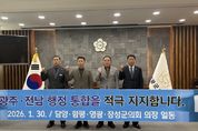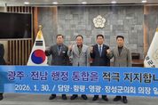 내고향뉴스 김익성 기자 | 담양군의회가 인구 소멸 위기 극복과 지역 경쟁력 강화를 위해 인근 의회와 손을 맞잡고 광주-전남 행정통합 추진에 힘을 보탰다. 담양·함평·영광·장성군 의장단은 ‘광주-전남 행정통합 염원 공동 퍼포먼스’를 펼치며, 행정구역의 경계를 넘어선 초광역 협력 체계 구축에 대한 강력한 의지를 표명했다. 이번 퍼포먼스는 단순한 선언을 넘어, 광주와 전남이 하나의 생활권이자 경제권으로 재편되어야만 수도권 집중화에 대응하고 자생적인 발전 동력을 얻을 수 있다는 절박한 공감대 속에서 마련됐다. 참석한 의장단은 성명을 통해 “행정통합은 지역의 미래 경쟁력 확보와 균형발전을 위해 더 이상 미룰 수 없는 시대적 소명”이라며, “지금이야말로 광주와 전남의 백년대계를 결정할 골든타임”이라고 강조했다. 특히 장명영 의장은 “담양은 광주와 인접한 지리적 이점과 생태문화 자원을 동시에 갖춘 지역으로, 행정통합 시 시너지 효과가 가장 클 것으로 기대되는 곳”이라며, “통합 과정에서 군민의 목소리가 소외되지 않고 실질적인 복지 증진과 지역 발전으로 이어질 수 있도록 정책적 역할을 다하겠다”고 말했다. &nb