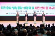 내고향뉴스 김익성 기자 | 대전시의회 조원휘 의장은 12일 대전시청에서 개최된 대전충남 행정통합 설명회 및 시민 한마음 촉구대회에 참석해 지방소멸 위기 속에서 진행되는 대전·충남 행정통합 특별법안의 조속한 의결을 시민들과 함께 촉구했다. 이번 행사는 지역을 대표하는 단체·기관장, 민관협의체, 직능·사회단체 등 600여 명이 참석한 가운데 행정통합 홍보영상 상영을 시작으로 주요내빈 인사말씀, 행통통합 설명, 촉구문 낭독 및 퍼포먼스 순으로 진행됐다. 조원휘 의장은 “지방 소멸, 수도권 1극 체제라는 국가적 위기 속에서 행정통합은 대전과 충남의 생존과 미래에 대한 가장 현실적이고 강력한 해답이고, 두 지역이 힘을 모으면 인구 350만 명, 지역내총생산 200조 원의 대한민국 3대 생활권을 이뤄내는 것이다”라면서, “대전시의회는 행정통합특별위원회를 출범해 제도 개선 및 시민 공감대 형성 등 선제적 정책 마련에 총력을 기울여 왔고, 앞으로도 국회와 국가 차원의 협력을 도모해 충청권이 대한민국 100년을 이끌 새로운 성장 축이 되도록 시민들과 함께 힘을 모아 반드시 이뤄내겠다”고 말했다.