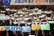내고향뉴스 장우석 기자 | 광주광역시는 12일 전남 고흥문화회관에서 ‘광주전남 행정통합 고흥군 상생토크’를 열고, 고흥군 발전 전략과 통합 이후 변화상에 대해 고흥군민들과 소통했다. 이번 행사는 여섯번째 열린 상생토크로, 통합 이후 고흥의 우주·해양·농어촌 자원을 활용해 광주·전남 균형발전을 이루기 위해 마련했다. 이날 행사에는 강기정 광주시장을 비롯해 공영민 고흥군수, 류제동 고흥군의회 의장, 고흥군민 등 600여 명이 참석해 광주전남 통합에 대한 높은 관심을 보였다. 강기정 시장은 먼저 광주전남 통합 추진상황과 향후 일정, 통합에 대한 정부 특전(인센티브) 등을 설명하며 통합 의지를 밝혔다. 강 시장은 이어 고흥군과 관련된 특별법안 특례조항으로 ▲광역생활권 지정과 교통복지 ▲항공우주 산업 육성 ▲문화관광 기반시설(인프라) 구축 지원 등을 소개했다. 특히 고흥을 비롯한 위기산업지역인 전남 동부권에 재정을 우선적으로 투입해 일자리를 지키고 광주·전남 균형발전을 이끌겠다는 구상을 발표했다. 이날 상생토크에서 공영민 고흥군수는 ▲안정적인 농어촌 재정 지원 ▲우주항공산업 육성 ▲