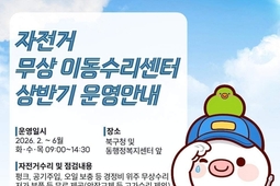 내고향뉴스 고광만 기자 | 상반기 자전거 무상 이동수리센터 운영 안내 북구에서는자전거 이용 활성화와 친환경 녹색도시 조성을 위해자전거 무상 이동수리센터를 운영합니다! ──────────────── 운영기간2026년 2월 ~ 6월(화·수·목 09:00 ~ 14:30 / 공휴일 미운영)※ 기상 여건 등에 따라 운영 일정은 일부 변경될 수 있습니다. 운영장소북구청 및 각 동 행정복지센터 앞 수리·점검 내용 펑크 수리, 공기 주입 부식 제거, 오일 보충 등 경정비 위주 무상 수리 저가 소모 부품 무료 제공 (※ 안장 교체 등 고가 수리는 제외) ☎️ 문의처✔️ 각 동 행정복지센터✔️ 북구청 건설과 ☎ 062-410-6773 ──────────────── 자전거 수리가 필요하셨던 주민 여러분!가까운 곳에서 무료 점검·수리 받아보세요 자세한 내용 확인하기 https://blog.naver.com/gjbukgu/224172467820