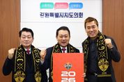 내고향뉴스 김익성 기자 | 강원특별자치도의회는 2026년 강원FC의 선전과 도내 축구 열기 확산을 위해 ‘시즌권 구매-기부 릴레이’에 동참한다. 강원특별자치도의회 의장 김시성과 김병지 강원FC 대표이사는 1월 14일 도의회 의장 집무실에서 강원FC 시즌권 구매-기부 릴레이를 진행했다. 이번 릴레이를 통해 강원특별자치도의회 명의로 기부된 시즌권은 평소 프로축구를 접하기 어려운 아동과 청소년에게 전달되어 도민 화합과 축구 저변확대에 기여할 것으로 기대된다. 도의회 김시성 의장은 “올 한해도 강원FC가 한 단계 더 도약하고 성장할수 있도록 지속적인 관심을 기울이겠다”며, “강원FC가 도민들에게 화합과 행복을 주는 구단으로 발전하기를 응원한다”고 말했다.