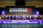 내고향뉴스 라정운 기자 | 경주시가 2025년 APEC 정상회의 개막을 한 달 앞두고 시민의 힘을 하나로 모아 성공개최 의지를 다졌다. 시는 30일 경주실내체육관에서 ‘2025년 APEC 정상회의 성공개최 범시민실천결의대회’를 성황리에 개최했다고 밝혔다. 이번 행사에는 APEC 범시도민지원협의회(공동회장 박몽룡·이상걸) 소속 회원을 비롯해 유관기관, 시민단체, 자원봉사자 등 경주시민 3천여 명이 참석해 시민과 함께하는 APEC의 진정한 의미를 되새겼다. 특히 주낙영 경주시장을 비롯해 김석기 국회 외교통일위원장, 이동협 경주시의장, 최병준 경북도의회 부의장을 비롯해 시·도의원 전원이 참석해 시민과 함께 손님맞이 실천 결의를 다지고 성공 개최를 향한 열기를 더했다. 행사장 내부에는 시민단체들이 자체 제작한 손님맞이 실천 결의 현수막이 곳곳에 걸려 있어, APEC 성공개최를 향한 시민들의 뜨거운 참여 의지를 생생하게 보여주었다. 본행사에 앞서 참석자들은 ‘APEC 시민 10대 실천과제’를 함께 되새기며, 모든 시민이 APEC의 주인으로서 행동할 때 성숙한 시민의식과 지속가능한 경주를 만들어