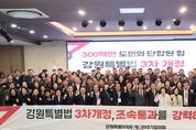 내고향뉴스 박성환 기자 | 강원특별자치도 범국민추진협의회(협의회장 최양희, 추진단장 김천수)가 11월 21일 11시, 춘천 스카이컨벤션 2층 컨벤션홀에서 강원특별법 3차개정 조속 통과 촉구 결의대회를 개최했다. 당초 정기총회를 개최할 예정이었으나 어제(11월 20일) 국회 행정안전위원회 법안소위에서 강원특별법 3차 개정이 논의가 불발되자 긴급 행동에 나섰다. 이날 결의대회에는 범추협 위원들을 비롯해 고문직을 맡고 있는 김진태 도지사, 김시성 도의회 의장 등 200여 명이 참석하여 조속 통과를 촉구하는 목소리를 높였다. 최양희 협의회장은 “오늘은 강원특별자치도의 성과를 함께 축하하는 날이 돼야 했지만, 어제 행안위에서 3차 개정을 또 미루는 바람에 오히려 우리의 결의를 더 크게 보여줘야 하는 날이 됐다”라며, “각 지역에서 올라오신 위원 여러분의 지혜와 네트워크가 어느 때보다 절실하다”라고 말했다. 김진태 강원특별자치도지사는 “3차 개정안이 처음 국회에 올라간 게 작년 9월인데, 1년이 넘도록 단 한 번도 심사를 하지 않았다”라며, “5극 3특을 강조하면서 특별자치도 법은 시간이 없다고 국회 심사가 미뤄지는