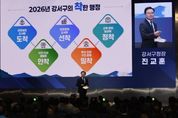 내고향뉴스 장동환 기자 | 진교훈 서울 강서구청장이 14일 “지역의 수많은 현안들을 하나하나 해결하면서 구민의 삶에 착! 다가가는 구정을 펼치겠다”고 강조했다. 진 구청장은 이날 오후 코엑스 마곡에서 열린 ‘2026년 신년인사회’에서 올해는 도전과 혁신으로 구민과 함께 성장하는 도약의 해가 될 것”이라며 이같이 말했다. 진 구청장은 ▲균형발전 도시에 도착 ▲안전‧안심 생활에 안착 ▲미래경제 도시에 선착 ▲복지‧건강 구민 곁에 밀착 ▲교육‧문화 일상에 정착 등 5가지 핵심전략을 제시하며 “구민이 일상에서 체감할 수 있는 착한 행정을 펼쳐나가겠다”고 재차 강조했다. 가장 먼저 제시한 과제는 고도제한 완화 신속 이행과 주거 환경 개선이다. 그는 ”고도제한 완화를 위한 밑그림은 그려졌지만 조기 시행과 강서구에 최적의 방안이 적용될 수 있도록 끊임없이 노력하겠다“며 ”지역 곳곳에서 추진 중인 재개발·재건축 등 정비사업들도 차질 없이 추진해 나가겠다“고 말했다. 또한, 대장홍대선 31년 개통, 강북횡단선 재추진 등을 통해 교통 인프라를 확충하겠다는 구상도 밝혔다. 이어 폭우, 폭설 등