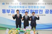 내고향뉴스 임정빈 기자 | 순천시는 여수‧광양시와 함께 13일 순천대학교 70주년기념관에서 제41차 여수‧순천‧광양시 행정협의회 정기회의를 열고, 전남 동부권의 미래 경쟁력 확보를 위한 공동건의 3건을 공식 의결했다고 밝혔다. 이번 회의는 이재명 정부의 지방주도성장 기조와 전남‧광주 행정통합 논의에 발맞춰 국가 기간산업의 중심지인 여수‧순천‧광양 지역이 전남광주통합특별시의 핵심 축으로 기능할 수 있도록 법적‧제도적 기반을 마련하는 데 뜻을 모았다. 첫째, ‘전남 동부권 상생균형발전과 산업대전환’을 위한 행‧재정 지원 근거를 특별법에 반영하는 내용이다. 3개 시는 석유화학‧철강 등 기존 주력 산업의 고부가가치화와 탄소중립 사회 전환에 대응해 RE100 기반 미래첨단산업 복합거점을 마련하고 이차전지‧반도체‧우주항공 등 신산업을 육성해 지방이 주도하는 경제 성장의 선도 모델을 완성하겠다는 구상이다. 또한 여수광양항의 북극항로 거점항만 육성과 여수공항 국제공항 승격도 핵심 과제로 건의해 전남 동부권의 글로벌 경쟁력을 확보하겠다는 전략이다. 둘째, 전남광주통합특별시 출범 시 3개 청사의 기능별 본부제 운영의