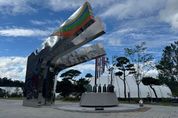 내고향뉴스 채필재 기자 | 영동세계국악엑스포조직위는 영동세계국악엑스포 개막과 함께 행사장 내에 설치된 상징조형물인 ‘전통의 울림, 미래를 울리다’의 제막식을 26일 개최했다고 밝혔다. 이날 제막식에는 국악엑스포 공동위원장인 정영철 영동군수, 윤영달 크라운해태 회장을 비롯해 민의식 국악 엑스포 집행위원장, 신현광 영동군의회 의장 등 주요 내빈이 참석해 자리를 빛냈다. 국악엑스포 상징조형물은 복합문화예술회관 옆에 높이 6미터, 세로 8.7미터, 가로 6.7미터 규모로, 금속 조각가 심병건 작가가 제작했다. ‘ㄱ’자 기울기에서 가장 맑은 소리를 내는 115도로 깎는 편경을 모티브로 하여 제작된 기하학적 구조의 세 개의 기둥은 국악이 지닌 맑고 청아한 울림을 형상화한다. 또, 음의 파동과 리듬으로 시각화된 율관과 한국 고유의 정체성을 의미하는 오방색 띠로 열린 세계를 향해 뻗어 나가는 에너지를 나타낸다. 세 개의 기둥과 함께, 중앙의 상단에 편종과 편경을 의미하는 파이프를 조형하여 ‘울림과 진동’이 이곳에서 시작돼 세상에 울려 퍼져나감을 표현했다. 16개의 편종은 관람객들이 각각을 두드려 직접 울림과 진동