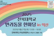 내고향뉴스 정미경 기자 | 반려동물과 시민이 함께 즐기는 축제가 반려동물 친화관광도시 익산에서 열린다. 익산시는 '2025 전북대학교 반려동물 한마당'이 오는 27일 오후 1시 전북대학교 익산특성화캠퍼스에서 다채롭게 펼쳐진다고 22일 밝혔다. 이번 행사는 전북대학교 수의과대학이 주최하며, 반려인과 시민 모두가 즐길 수 있는 풍성한 볼거리와 체험거리를 선보인다. 행사장에서는 △멍냥 그립톡 만들기 △발도장 추억액자 △반려동물 건강검진 등 체험 부스가 운영된다. 또 반려동물 산책룩 펫션쇼와 OX 퀴즈, 사진 콘테스트 등 무대 프로그램이 마련돼 현장 열기를 더한다. 아울러 전북대 수의과대학 박철 교수와 윤지선 교수의 강연으로 유익한 정보를 전달하고, '일일 수의사 체험'을 통해 미래 수의사를 꿈꾸는 청소년들에게 특별한 진로 경험도 제공한다. 방문객들에게는 리유저블백, 텀블러, 부채 등으로 구성된 기념 선물이 주어진다. 이 밖에도 부스별 스탬프 투어와 이벤트 무대 프로그램을 통해 제공되는 펫 드라이기, 자동 급식기, 강아지 유모차, 카시트 등 푸짐한 경품도 현장의 즐거움