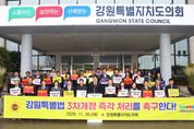 내고향뉴스 김익성 기자 | 강원특별자치도의회는 25일 오후 1시 30분 도의회 본관 앞에서 ‘강원특별법 3차 개정안’의 조속한 국회 심사를 촉구하는 결의대회를 열었다. 이번 결의대회는 개정안이 발의된 이후 국회에서 심사조차 제대로 이뤄지지 않고 있는 상황에 대한 도민들의 인내 한계와 지역 균형발전에 대한 요구가 높아진 데 따른 것이다. 강원특별법 3차 개정안은 지난해 9월 한기호 의원과 송기헌 의원이 공동 발의했으나 현재까지 단 한 차례도 행안위 법안심사소위가 개최되지 않는 등 심사 지연이 장기화되고 있는 것으로 알려졌다. 정기국회 종료가 임박한 상황에서 이번 회기 내 법안 처리를 위한 시급성도 부각되고 있다. 이날 결의대회에는 국회 앞에서 릴레이 1인 시위를 이어가고 있는 박윤미 부의장과 이한영 운영위원장을 제외한 전 도의원이 참석했다. 문관현 기획행정위원장이 낭독한 결의문에는 ▲ 강원특별법 3차 개정안의 즉각 처리 요구 ▲ 개정안이 통과될 때까지 끝까지 투쟁하겠다는 결의 ▲ 300만 강원도민의 생존권 수호하겠다는 의지가 담겼다. 도의회는 결의대회 직후 결의문을 국회에 전