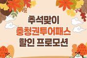 내고향뉴스 고광만 기자 | 충청광역연합(연합장 김영환)은 민족 대명절 추석을 맞아 충청권 대표 관광상품 ‘충청권투어패스’의 특별 할인 프로모션을 진행한다고 밝혔다. 충청권투어패스는 대전·세종·충북·충남 4개 시·도의 주요 관광지를 하나의 패스로 편리하게 즐길 수 있는 통합 이용권이다. 평상시에도 관광지 정상 요금 대비 약 50% 저렴하게 이용할 수 있는 합리적인 관광상품이면서 전체 가맹점 중 이용객이 원하는 관광지를 자유롭게 선택할 수 있는 장점이 있다. 이번 프로모션에서는 충청권투어패스 ‘빅2(2곳 이용권)’ 상품을 정상가 29,900원에서 2만원 할인된 9,900원에 제공한다. 판매 수량은 총 3천 매 한정이며, 9월 26일부터 10월 12일까지 네이버 스마트스토어를 통해 구매할 수 있다. 사용 기한은 10월 31일까지다. 한편, 충청광역연합은 충청권투어패스의 상품 경쟁력 강화를 위해 관광지나 체험시설 뿐 아니라 식음료 업종(카페 등)까지 신규 가맹점 모집을 확대하고 있다. 가맹점으로 등록하면 투어패스 공식 채널 홍보와 주요 온라인 판매망 연계 등 다양한 혜택을 누릴 수 있어 관광객 유입 효과가 기대된다.