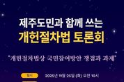 내고향뉴스 김익성 기자 | 제주특별자치도의회, 제주특별자치도 주민자치위원회협의회, 제주대학교 리걸클리닉센터, 제주미래디자인포럼, 사회적협동조합 제주로 공동 주최로 11월 25일 오전 10시, 제주특별자치도의회 1층 대회의실에서 '제주도민과 함께 쓰는 개헌절차법 토론회'를 개최한다. 국민주권 시대에 국민이 주도하는 헌법 개정 요구가 커지고 있고 이에 시민의회 방안, 국민청원 방안, 추진협의회 방안 등 국민참여방안을 담은 개헌절차법안이 3건이 국회에 발의됐지만 3건 법안의 국민참여방안은 제주도민의 의견을 충분히 반영하기에는 미흡하다는 지적이 있음에따라 이번 토론회는 제주도민의 목소리가 실질적으로 담길 수 있는 개헌절차법 제정 방안을 깊이 있게 모색하기 위해 마련됐다. 토론회는 이상봉 제주특별자치도의회 의장의 인사말로 시작하여 이남근 제주특별자치도의회 의원이 좌장을 맡고 신용인 제주대학교 로스쿨 교수가 '개헌절차법상 국민참여 방안 쟁점과 과제'를 주제로 발표할 예정이다. 또한 고정학 제주특별자치도주민자치위원회협의회장, 신훈민 변호사, 양광수 아라동 주민자치위원장, 조현주 국민주도상생개헌행동 상임공동대표가 제주도민의