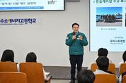 내고향뉴스 김익성 기자 | 완주군의회 김재천 부의장이 지난 24일 수소에너지고등학교에서 실시된 채용 후보자(장학생) 선발 제도 설명회에 참석해 수소고등학교 학생들을 격려하고, 수소에너지고등학교 교장과 한솔케미칼 관계자 등과 함께 취업 연계방안에 대해 논의를 이어갔다. 또한, 김 부의장은 지역 산업과 교육 현장을 잇는 가교 역할을 수행하며 추진한 산학협력이 우수인재 양성과 지역정주 지원 강화라는 실질적 성과를 확인하고, 확대방안을 모색했다. 김재천 부의장의 중재와 지속적인 협의를 통해 체결된 한솔케미칼 전주공장과 수소에너지고등학교 간 업무협약(MOU)이 본격 시행되면서, 수소에너지고 학생들의 안정적인 진로 설계와 취업 기회가 크게 확대됐다. 특히 지난 2024년도 체결한 협약에 올해에 이어 2026학년도 신입생부터 매년 4명의 장학생을 선발하고, 이 가운데 2명의 우수 인재를 한솔케미칼에서 채용하는 체계적인 취업 연계 모델이 가동된다. 이는 교육–장학–채용으로 이어지는 선순환 구조를 통해 지역 우수인재를 체계적으로 양성하고, 졸업 후 지역 내 정주를 유도하는 데 초점을 맞추고 있다. 배지