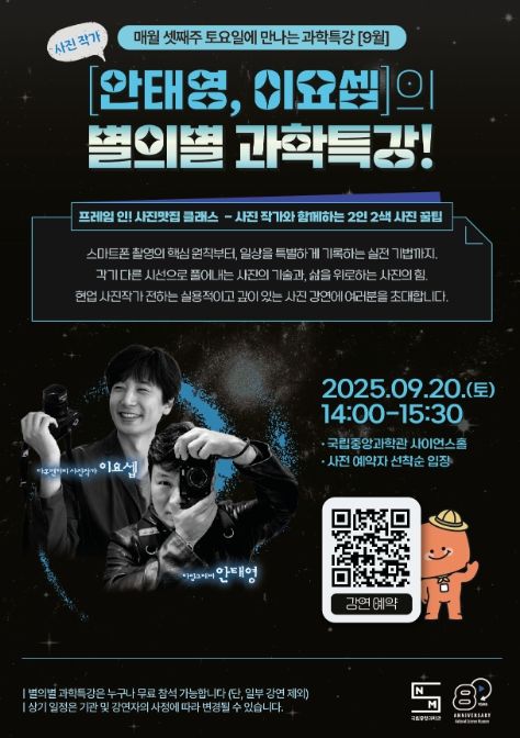 과학기술정보통신부 국립중앙과학관은 매월 셋째 주 토요일에 개최하는 ‘별의별 과학특강’의 9월 강연에 사진 분야에서는 개성 있는 작품 세계로 잘 알려진 두 명의 전문작가 안태영과 이요셉을 초청해 강연을 개최한다고 밝혔다. 안태영 작가는 일상의 순간을 특별하게 담아내는 ‘타임그래퍼’로, 스마트폰을 활용해 평범한 풍경을 낭만적인 장면으로 기록하는 작업으로 주목 받고 있다. 이요셉 작가는 다큐멘터리 사진 작가로 사진과 영상, 글과 그림을 결합한 스토리텔링 작업으로 잘 알려져 있으며 NGO와의 협업, 구호 활동 참여 등 사회적 메시지를 담은 작품 활동도 활발하다.